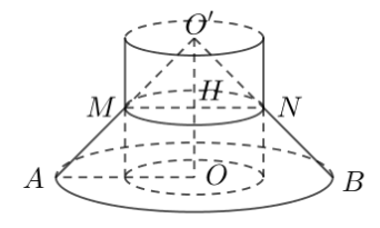 Cho khối trụ có bán kính là \(R\) chiều cao \(h\), hai đường tròn đáy có tâm là \(O\) và \(O'\). Một khối nón có đỉnh trùng với \(O'\) và đáy có tâm \(\left( {O;2R} \right)\). Gọi \({V_1}\) là thể tích phần khối nón nằm bên ngoài khối trụ, \({V_2}\) là thể tích phần khối trụ nằm bên ngoài khối nón. Tính \(\dfrac{{{V_1}}}{{{V_2}}}\)