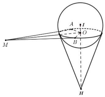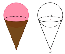 Một cơ sở sản xuất kem làm một mô hình Kem ốc quế lớn gồm 2 phần: Phần Kem có dạng hình cầu, phần ốc quế có dạng hình nón (như hình vẽ bên). Chủ cơ sở sản xuất muốn gắn một chiếc đèn Led lớn chiếu thẳng cây kem vào buổi tối, biết rằng chiếc đèn nằm trên mặt phẳng chứa đường tròn \(\left( C \right)\) là phần tiếp xúc giữa phần Kem và phần ốc quế. Chọn hệ trục tọa độ \(Oxyz\) trong không gian thỏa mãn phần Kem có hình cầu có tâm \(I\left( {1;2;3} \right)\), bán kính \({R_C} = 3\) và phần đỉnh của hình nón là điểm \(H\left( {0;1; - 2} \right)\) đáy là đường tròn có bán kính \({R_N} = \sqrt 6 \). Để tối ưu hóa lượng ánh sáng chiếc đèn có thể chiếu vào cây kem người ta tính toán rằng chiếc đèn Led sẽ phải ở vị trí \(M\left( {a;b;2} \right),\,\,a \in \mathbb{Z}\) và từ điểm \(M\) kẻ được 2 tiếp tuyến với đường tròn \(\left( C \right)\) sao cho góc giữa hai tiếp tuyến đó không bé hơn \(60^\circ \). Có bao nhiêu vị trí đã đặt chiếc đèn Led thỏa mãn yêu cầu của chủ cơ sở.
