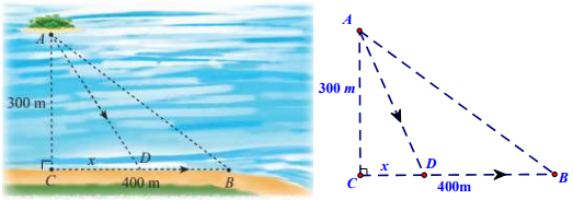 Trong một trò chơi thử thách, bạn Giáp đang ở trên thuyền (vị trí A) cách bờ hồ (vị trí C) 300 m và cần đi đến vị trí B trên bờ hồ như hình vẽ dưới đây, khoảng cách từ C đến B là 400 m . Lưu ý là Giáp có thể chèo thuyền thẳng từ A đến B hoặc chèo thuyền từ A đến một điểm nằm giữa C và B rồi chạy bộ đến B.
