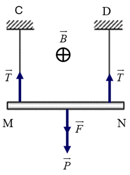 Thanh MN dài \(L = 20cm\) có khối lượng 5 g treo nằm ngang bằng hai sợi chỉ mảnh CM
