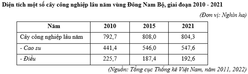 Căn cứ vào bảng số liệu trên, tỉ trọng diện tích cây cao su so với tổng diện tích cây công nghiệp của Đông Nam Bộ năm 2021 là bao nhiêu % (làm tròn kết quả đến số thập phân thứ nhất của %).