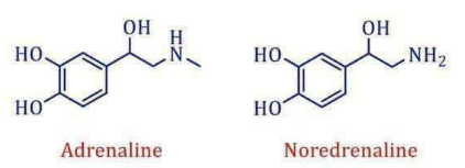 Nhóm chất Catechoamine có nhiều loại nhưng trong cơ thể người bao gồm ba chất chủ yếu Dopamine "hormon hạnh phúc, ngoài ra còn có Adrenaline (Epinephrine) và Noradrenaline (Norepinephrine) được sử dụng khá phổ biến trong y học nhờ chức năng cấp cứu tím mạch. Adrenaline và Noradrenaline là 2 hormone quan trọng, đóng vai trò không thể phủ nhận trong cách cơ thể chúng ta phản ứng trước những tình huống cũng thẳng và nguy hiểm. Adrenaline và Norepinephrine công thức cấu tạo như sau: