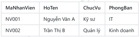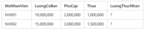 | b) Công thức tính LuongThucNhan là LuongCoBan + PhuCap - Thue . | ||