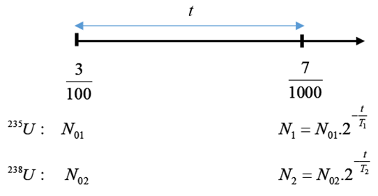 Hiện nay urani tự nhiên chứa hai đồng vị phóng xạ \(^{235}U\) và \(^{238}U,\) với tỉ lệ số hạt \(^{235}U\) và số hạt \(^{238}U\) là \(\dfrac{7}{{1000}}\) . Biết chu kì bán rã \(^{235}U\) và \(^{238}U\) lần lượt là \(7,{00.10^8}\) năm và \(4,{50.10^9}\) năm. Nếu tỷ lệ số hạt \(^{235}U\) và số \(^{238}U\) trong tự nhiên là \(\dfrac{3}{{100}}\) thì cách đây bao nhiêu tỉ năm ? (lấy 2 chữ số thập phân)
