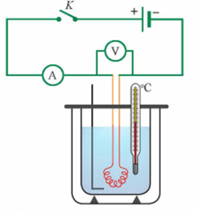 Hình bên là sơ đồ bố trí thí nghiệm đo nhiệt dung riêng của nước. Một học sinh làm thí nghiệm với 150 g nước, nhiệt độ ban đầu là \({62^0}C\). Số chỉ vôn kế và ampe kế lần lượt là 1,60 V và 2,50 A. Sau khoảng thời gian 8 phút 48 giây thì nhiệt độ của nước là \({65^0}C\). Bỏ qua nhiệt lượng mà bình nhiệt lượng kế và đũa khuấy thu vào. Nhiệt dung riêng của trước trong thí nghiệm này là bao nhiêu J/kg.K ?( làm tròn đến phần nguyên).