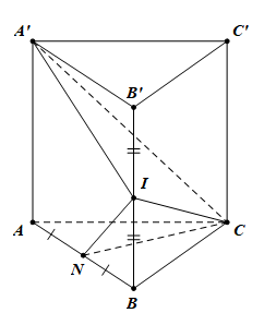 Gọi N là trung điểm AB. Chứng minh \(NI \bot IA'\). Do đó, góc phẳng nhị diện \(\left[ {C,IA',B} \right]\) là \(\angle {CIN}\).