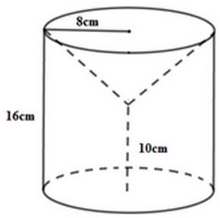 Người ta muốn tạo một cái khuôn đúc dạng hình trụ, có chiều cao bằng 16cm, bán kính đáy bằng 8cm, mặt đáy trên lõm xuống dạng hình nón và khoảng cách từ đỉnh hình nón đến mặt đáy dưới hình trụ bằng 10cm (như hình vẽ bên). Tính diện tích toàn bộ mặt khuôn (lấy \(\pi {\rm{\;}} = 3,14\))