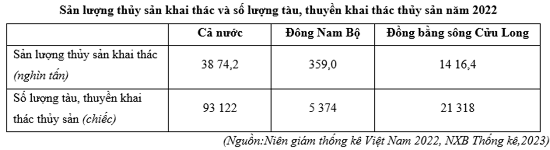 Dựa vào bảng số liệu trên, cho biết số lượng tàu, thuyền của Đồng bằng sông Cửu Long năm 2022 gấp bao nhiêu lần Đông Nam Bộ. (Làm tròn kết quả đến số thập phân thứ hai của đơn vị số lần)