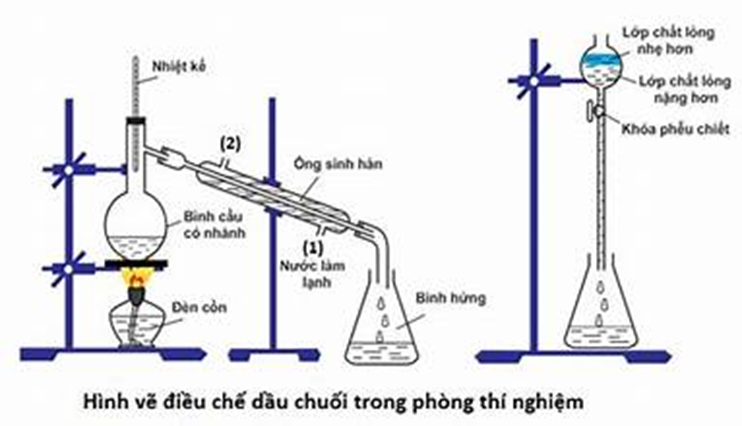 | a) Chất lỏng có trong bình cầu có nhánh là isoamyl alcohol, acetic acid, và sulfuric acid đặc. | ||