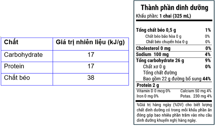 Khi tiêu thụ các loại thực phẩm và đồ uống thì carbohydrate, protein và chất béo sẽ cung cấp năng lượng cho cơ thể. Hình bên là nhãn thực phẩm trên một loại coffee đóng chai. Dưới đây là giá trị nhiên liệu của một số chất có trong chai coffee. Giá trị nhiên liệu là năng lượng giải phóng khi đốt cháy hoàn toàn 1 g chất.