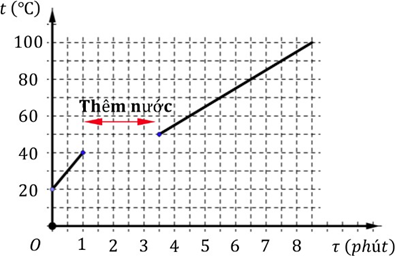 Một ấm đun nước pha trà có công suất không đổi và có nhiệt kế hiển thị nhiệt độ tức thời của nước trong ấm. Một bạn học sinh dùng ấm này để đun nước với lượng nước có sẵn ở trong ấm, nhiệt độ hiển thị ban đầu là \({t_0} = {20^0}C\). Sau khoảng thời gian đun \({\tau _1} = 1phut\) thì nhiệt độ của nước tăng lên tới \({t_1} = {40^0}C\) và bạn học sinh bắt đầu thêm nước ở nhiệt độ \({t_x}\) vào trong ấm. Tại thời điểm \({\tau _2} = 3,5phut\) thì nhiệt độ của nước đạt \({t_2} = {50^0}C\). Sau khoảng thời gian 5 phút kể từ thời điểm \({\tau _2}\) thì nước bắt đầu sôi. Hình vẽ bên là đồ thị biểu diễn nhiệt độ của nước trong ấm trong quá trình đun. Bỏ qua mất mát nhiệt ra môi trường và quá trình trao đổi nhiệt diễn ra nhanh chóng.