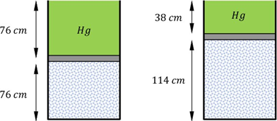 Một cylinder hình trụ chiều cao 152 cm được đậy kín bằng một piston nhẹ có thể di chuyển không ma sát trong cylinder. Nửa dưới của hình trụ chứa khí lí tưởng, còn nửa trên chứa thủy ngân (hình vẽ). Ban đầu nhiệt độ của khí trong piston là 600 K, tăng dần nhiệt độ lên thì thấy một nửa thủy ngân thoát ra bên ngoài. Cho rằng sự giãn nở của thủy ngân do nhiệt độ là không đáng kể, áp suất khí quyển p0 = 76 cmHg.