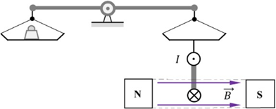 Một khung dây dẫn hình vuông, cạnh a = 10 cm có 200 vòng dây. Khung được treo thẳng đứng dưới một đĩa cân. Cạnh dưới của khung nằm ngang trong từ trường đều của nam châm chữ U và vuông góc với vector cảm ứng từ như hình vẽ. Sau khi thiết lập trạng thái cân bằng cho các đĩa cân, người ta cho dòng điện có cường độ I = 0,5 A chạy qua khung dây. Biết cảm ứng từ giữa hai cực của nam châm là B = 0,002 T. Lấy g = 10 m/s2. Phải thêm ở đĩa cân bên kia một khối lượng bằng bao nhiêu để cân thăng bằng? Kết quả tính bằng gam (g)?