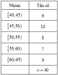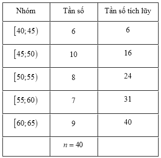 Cho bảng số liệu ghép nhóm như sau:Nhóm đầu tiên có tần số tích lũy lớn hơn hoặc bằng