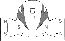 Tàu đệm từ là một phương tiện giao thông hiện đại, tàu hoạt động nhờ cơ chế nâng, đẩy và dẫn đường của hệ thống các nam châm điện. Ở một thời điểm, nam châm điện trên đường ray và thân tàu có các cực như hình vẽ bên. Hợp lực của các lực từ tác dụng lên thân tàu có hướng