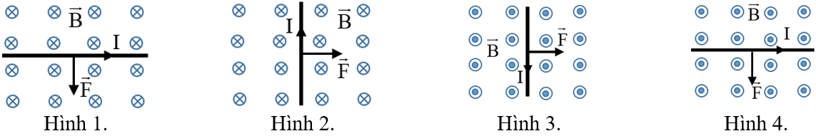Hình nào dưới đây biểu diễn đúng chiều của lực từ \(\overrightarrow F \) tác dụng lên dây dẫn mang dòng điện đặt trong từ trường đều?