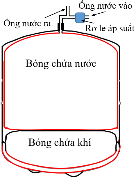 Một bình tích áp được sử dụng trong máy lọc nước có hai phần: bóng chứa nước và bóng chứa khí như hình bên. Khi chưa chứa nước, bóng chứa khí chiếm toàn bộ thể tích trong bình là 12 lít, áp suất 120 kPa. Đường ống dẫn nước vào, ra bóng chứa nước có gắn rơ le áp suất điều khiển đóng mở mạch điện. Khi lượng nước trong bóng chứa nước tăng đến 9 lít thì áp suất nước đạt cực đại, rơ le ngắt mạch, máy ngừng cung cấp nước vào bình. Khi lượng nước trong bình giảm đến 6 lít, rơ le tự động đóng mạch để máy cung cấp nước trở lại. Coi nhiệt độ trong bóng chứa khí không đổi, các bóng mềm, tổng thể tích nước và khí bằng thể tích bình, mặt tiếp xúc của bóng chứa nước và chứa khí luôn có dạng phẳng.