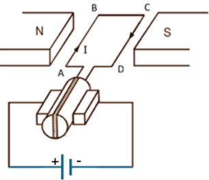 Sử dụng thông tin sau đây cho Câu 1 và Câu 2: Hình vẽ bên mô tả nguyên lý hoạt động của động cơ điện một chiều. Khung dây hình chữ nhật ABCD có kích thước AB = 30 cm, BC = 20 cm, đặt trong từ trường đều của nam châm có độ lớn cảm ứng từ B = 0,6 T. Dòng điện một chiều có cường độ I = 5 A chạy qua khung dây. Tại thời điểm xét, mặt phẳng khung dây song song với đường sức của từ trường.