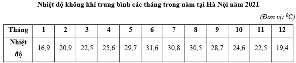 Căn cứ vào bảng số liệu trên, cho biết nhiệt độ trung bình năm tại Hà Nội năm 2021 (làm tròn kết quả đến một chữ số thập phân của 0C)