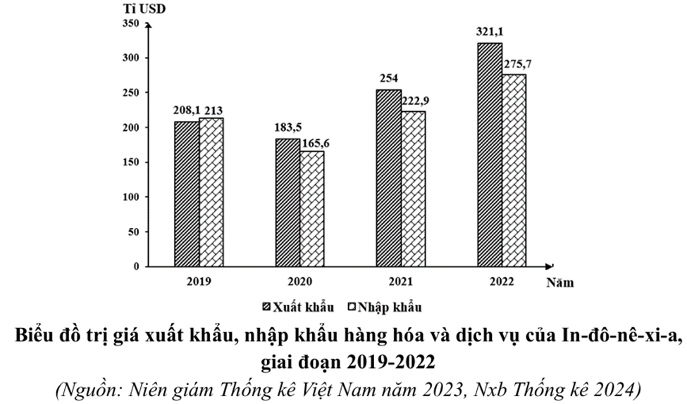 | b) Từ năm 2020 đến năm 2022, In-đô-nê-xi-a có cán cân thương mại xuất siêu. | ||
