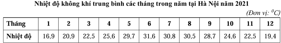 Căn cứ vào bảng số liệu, hãy cho biết biên độ nhiệt độ không khí trung bình năm 2021 tại Hà Nội là bao nhiêu °C (làm tròn kết quả đến một chữ số thập phân)
