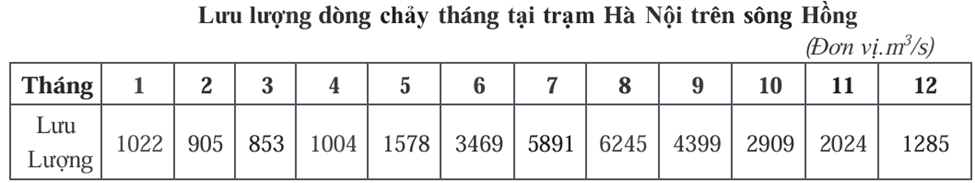 Căn cứ vào bảng số liệu, hãy cho biết lưu lượng dòng chảy trung bình năm tại trạm Hà Nội trên sông Hồng là bao nhiêu m3/s (làm tròn kết quả đến hàng đơn vị)
