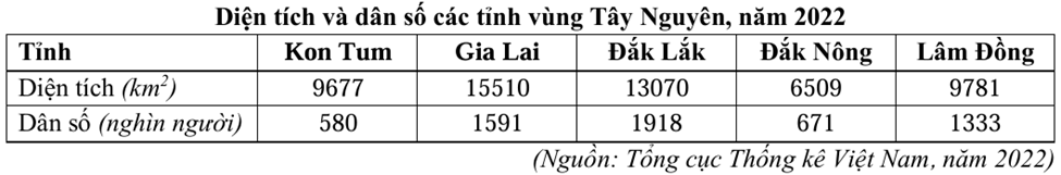 Căn cứ vào bảng số liệu, hãy cho biết mật độ dân số trung bình của vùng Tây Nguyên (làm tròn kết quả đến hàng đơn vị)