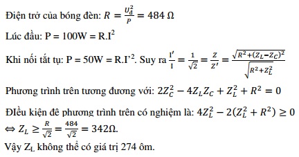 (với U và không đổi) vào hai đầu đoạn mạch mắc nối tiếp gồm đèn sợi đốt có ghi 220V – 100W, cuộn cảm thuần có độ tự cảm L và tụ điện có điện dung C. Khi đó đèn sáng đúng công suất định mức. Nếu nối tắt hai bản tụ điện thì đèn chỉ sáng với công suất bằng 50W. Trong hai trường hợp, coi điện trở của đèn như nhau, bỏ qua độ tự cảm của đèn. Cảm kháng của cuộn dây không thể là giá trị nào trong các giá trị sau?
