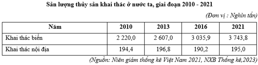 Cho bảng số liệu: Cho biết tỉ trọng sản lượng thủy sản khai thác