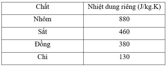 Bảng bên là thông số nhiệt dung riêng của một số chất. Nếu các miếng Nhôm, Đồng, Sắt, Chì
