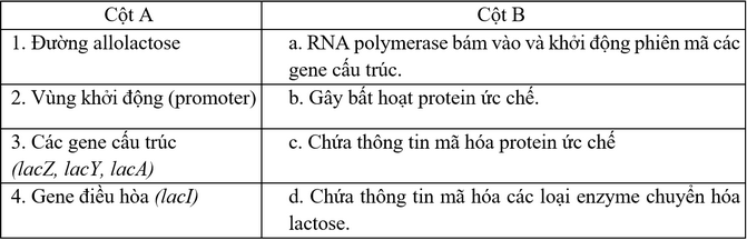 Ghép cột A với cột B sao cho phù hợp với mô tả về cơ chế điều hoà biểu hiện gene của operon lac ở vi khuẩn E. coli.