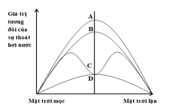 Hình sau biểu diễn quá trình thoát hơi nước của cây sống trong điều kiện khô hạn. Trong các đường cong A, B, C, D, đường cong nào mô tả sự thoát hơi nước qua lớp cutin (cuticle)?