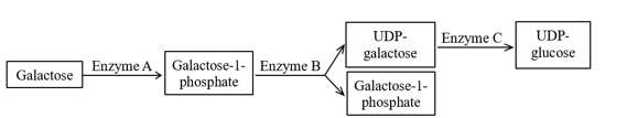 Ở người, bệnh galactosemia là bệnh rối loạn chuyển hóa do đột biến gene lặn trên nhiễm sắc thể thường gây thiếu hụt enzyme trong con đường chuyển hóa galactose thành UDP - glucose. Khi trong kiểu gene có đủ các allele trội A, B, C mã hóa các enzyme tương ứng A, B, C quy định kiểu hình bình thường, các kiểu gene còn lại quy định bệnh galactosemia. Con đường chuyển hóa galactose được mô tả ở hình sau: