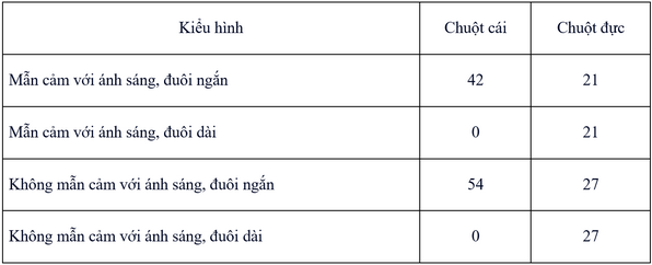 | d) Nếu cho chuột đực F1 lai phân tích thì trong số các con đực thu được ở đời con, tỉ lệ chuột mẫn cảm với ánh sáng, đuôi dài là 37,5%. |