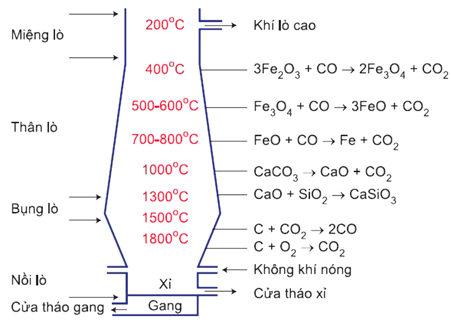 Quá trình sản xuất gang trong lò cao xảy ra các phản ứng như hình vẽ bên dưới: