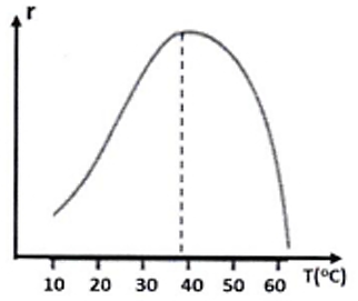 Trong cơ thể người, tinh bột bị thủy phân bởi enzyme amylase để phân hủy thành phân tử đường nhỏ hơn mà cơ thể có thể hấp thụ được. Sự phụ thuộc vào của tốc độ thủy phân tinh bột (r) và nhiệt độ (T) của phản ứng được xác mô tả như hình bên. Phát biểu nào sau đây là đúng?