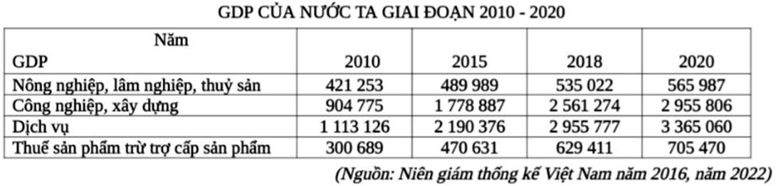 Cho bảng số liệu (Đơn vị: tỉ đồng). GDP của nước ta năm 2020 tăng gấp bao nhiêu lần so