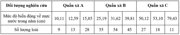 Hiện tượng đóng băng đã xảy ra vào mùa đông trên các dòng suối nhỏ thường gây ra lũ lụt vào mùa xuân và khô hạn trong mùa khô. Bảng kết quả sau thể hiện kết quả nghiên cứu số lượng loài động vật của 3 quần xã (A, B, C) ở nhiều dòng suối có biến động khác nhau về mực nước trong năm.