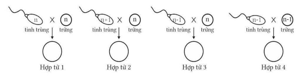 Hình dưới mô tả cơ chế hình thành hợp tử từ các giao tử đực và cái. Có bao nhiêu hợp tử hình thành thể đột biến lệch bội?