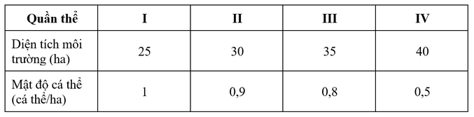 Để duy trì và phát triển quần thể loài A cần có số lượng cá thể ít nhất là 25 cá thể/ quần thể. Biết không có hiện tượng di - nhập cư. Người ta thống kê 4 quần thể của loài ở các môi trường ổn định khác nhau, thu được kết quả như sau.