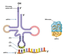 | b) mRNA có cấu trúc 1 mạch thẳng, làm khuôn cho quá trình phiên mã và mang bộ ba mở đầu là 3’ GUA 5’. | ||