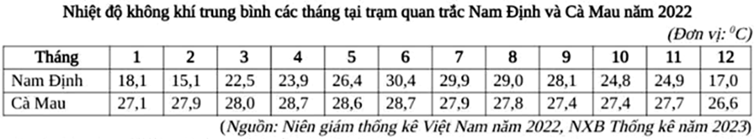 Căn cứ vào bảng số liệu trên, hãy cho biết biên độ nhiệt năm 2022 tại trạm quan trắc Nam Định cao hơn biên độ nhiệt năm 2022 tại trạm quan trắc Cà Mau là bao nhiêu ℃ (làm tròn kết quả đến một chữ số thập phân)