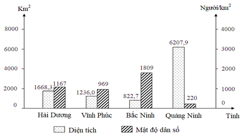 Cho biểu đồ: DIỆN TÍCH VÀ MẬT ĐỘ DÂN SỐ MỘT SỐ TỈNH CỦA NƯỚC TA NĂM 2022