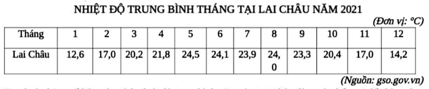 Căn cứ vào bảng số liệu trên, tính nhiệt độ trung bình năm của Lai Châu (làm tròn kết quả đến hàng đơn vị của °C).