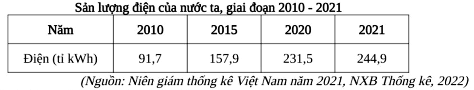Tốc độ tăng trưởng sản lượng điện nước ta năm 2021 so với năm 2010 = Sản lượng năm 2021: sản lượng năm 2010 x 100