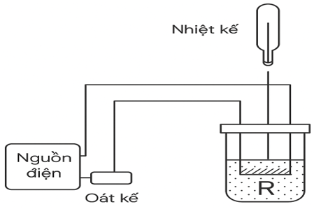 Một học sinh đo nhiệt dung riêng của chất lỏng theo sơ đồ thí nghiệm như hình vẽ. Sau 9,0 phút dòng điện đi qua dây điện trở R thì nhiệt độ chất lỏng tăng từ 25,00C tới 75,00C. Khối lượng chất lỏng trong nhiệt lượng kế là 60,0 g; số chỉ của Oát kế là 15,0 W. Biết rằng, nhiệt lượng cung cấp bởi dây điện trở cũng làm cho nhiệt lượng kế nóng lên.