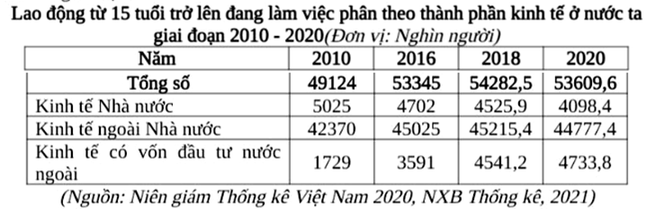 Cho biết tỉ trọng lao động 15 tuổi trở lên đang làm việc trong khu vực ngoài Nhà nước năm 2020 của nước ta gấp bao nhiêu lần khu vực Nhà nước? (làm tròn kết quả đến 1 chữ số thập phân).