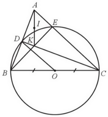 c) Gọi I là trung điểm của AK, từ đó chứng minh \({\rm{IA}} = {\rm{IK}} = {\rm{IE}} = {\rm{ID}}\) và kết luận.
