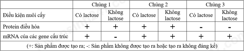 Khi nghiên cứu về hoạt động của Operon Lac ở ba chủng vi khuẩn E.coli, người ta thu được kết quả như sau: