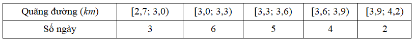 Mỗi ngày bác Hương đều đi bộ để rèn luyện sức khỏe. Quãng đường đi bộ mỗi ngày (đơn vị: km) của bác Hương trong 20 ngày được thống kê lại ở bảng sau: